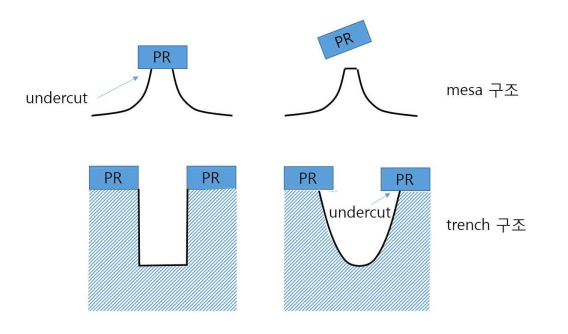 - trench 구조는 도랑처럼 밑이 파여있어 wet etching시 PR 내부가 깎여나가 원하는 모양으로 다듬기 굉장히 어렵게 됩니다.