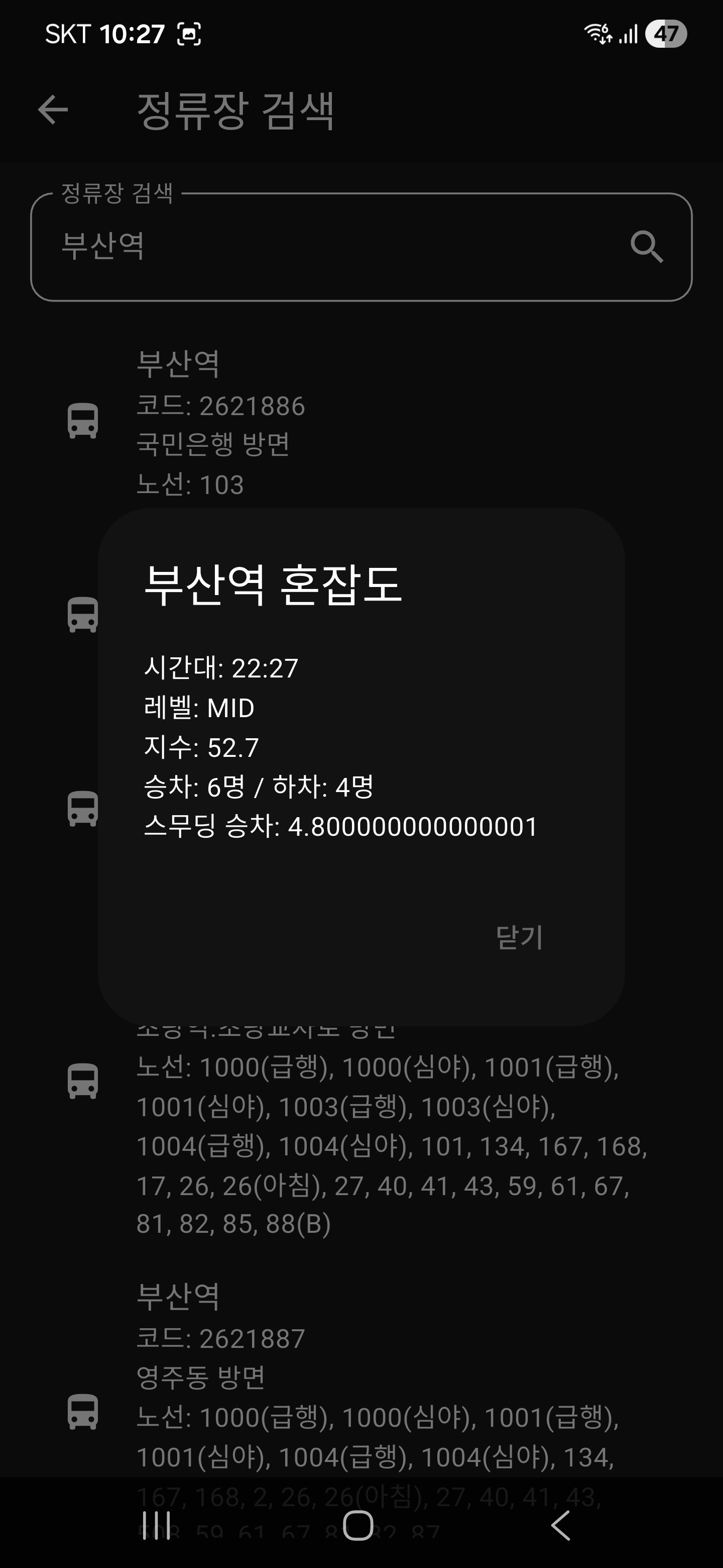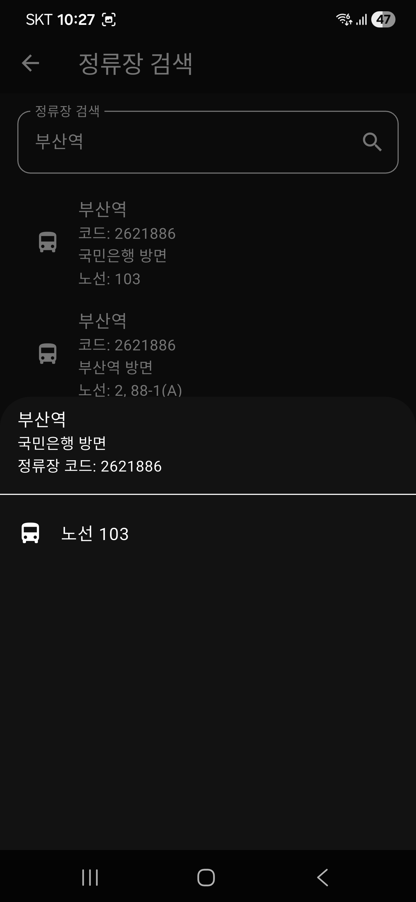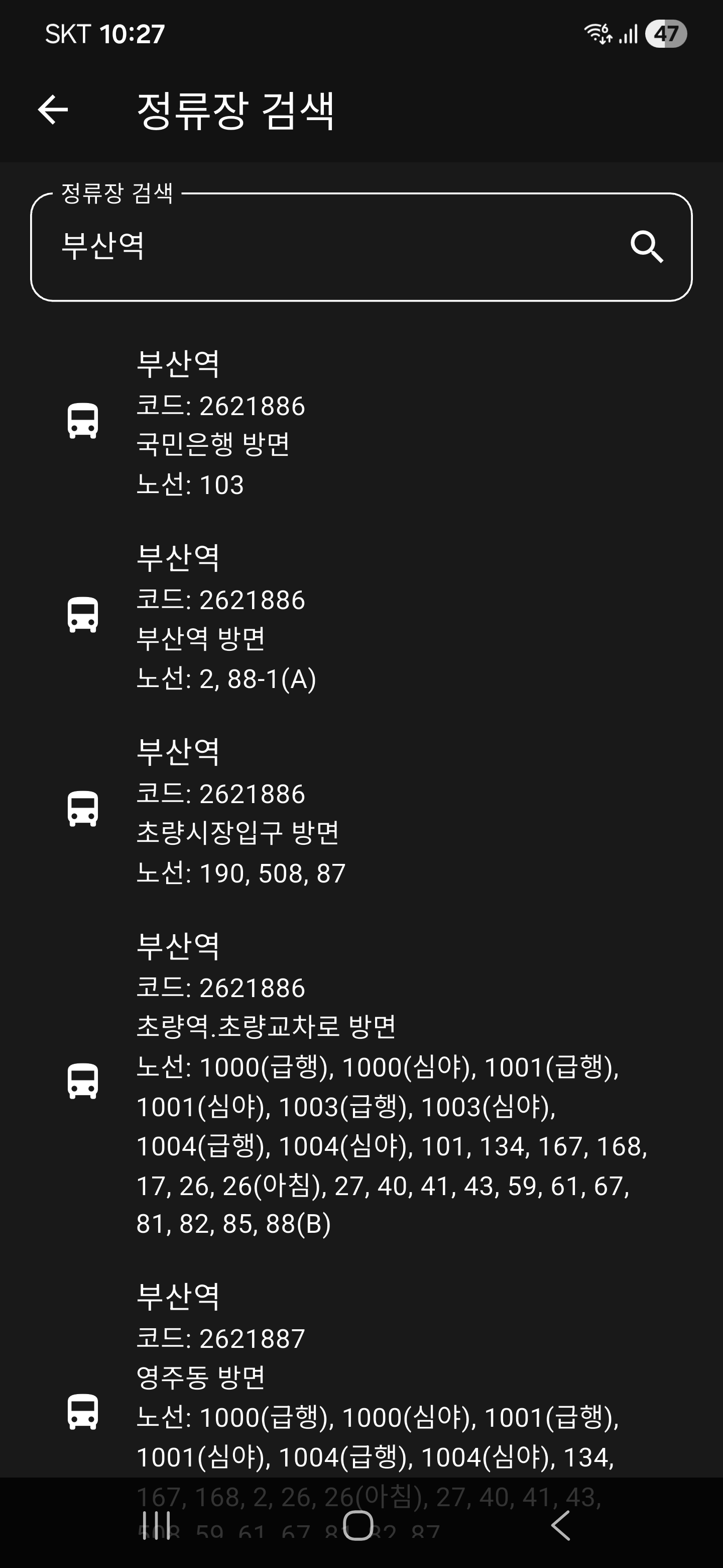 부산 지역에서의 정류장 명을 쓰면 그와 관련된 정류장 방면 리스트가 출력된다.